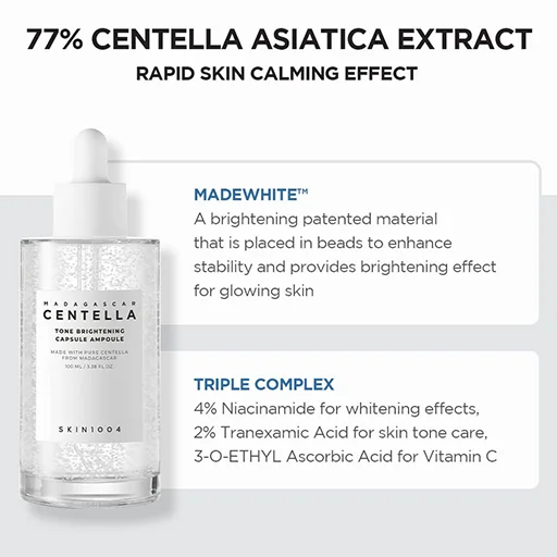 آمپول سنتلا ماداگاسکار از برند محبوب و باکیفیت اسکین 1004 است که موجب ایجاد حس تسکین و آرامش در پوست میشود و تعادل از دست رفته را به پوست باز میگرداند؛ همچنین با خاصیت آبرسانی و رطوبت رسانی موجب افزایش لطافت و نرمی پوست میشود. امپول سنتلا اسکین ۱۰۰۴ مدل تسکین دهنده و رطوبت رسان، حاوی عصاره سنتلا آسیاتیکا (100%) است که آرامش و التیام را به پوست هدیه داده و موجب افزایش شادابی و سلامت و روشن کنندگی ساختمان پوست میشود.